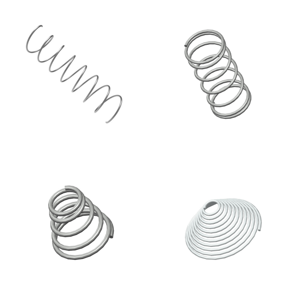 Springs are composed of an elastic material that stores mechanical energy when compressed or stretched and releases it when decompressed or released. These are typically made of various types of metal and formed into a coil or helix. Types include compression, tapered, extension, drawbar, and torsion.