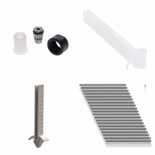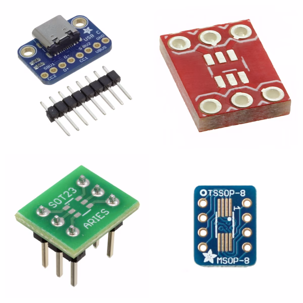 Prototyping and manufacturing products include materials and tools used to assemble small quantities of electronic circuits for development, research, repair, or similar purposes. Examples include solderless breadboards and adapters (for use with surface mount integrated circuits), perforated and non-perforated circuit board materials, and tools for producing printed circuit boards using chemical or mechanical processing techniques.